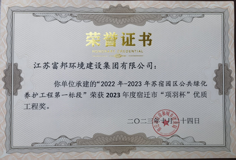 近日,由宿遷市蘇宿園區(qū)建設發(fā)展有限公司負責管理的蘇宿工業(yè)園區(qū)2022-2023年公共綠化養(yǎng)護工程第一、二標段,同時榮獲2023年度宿遷市“項羽杯”優(yōu)質工程獎。