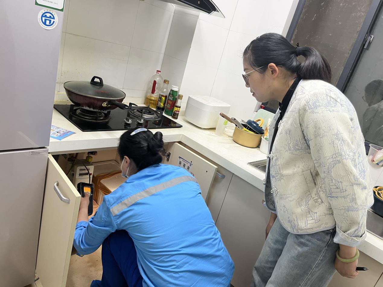 工作人員對(duì)燃?xì)庥脩糸_(kāi)展逐戶檢查,重點(diǎn)對(duì)天然氣接口軟管是否老化、燃?xì)馄骶呤欠癯谑褂?、是否有熄火保護(hù)措施,燃?xì)忾y門(mén)是否正常使用等問(wèn)題進(jìn)行全面檢查。在檢查過(guò)程中,發(fā)現(xiàn)廚房操作間積堆物品、線路交叉重疊等現(xiàn)象,要求客戶立即整改。