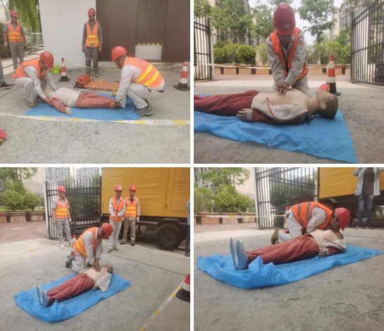 “快來人啊,有人觸電了!”,隨著一聲呼救,演練正式開始。演練人員按照預(yù)案,迅速采取各項(xiàng)應(yīng)急處置措施:立即斷開電源,移動(dòng)觸電者,判斷觸電者意識(shí),撥打120請求救援,向上級(jí)報(bào)告事故情況,開展臨時(shí)救護(hù),采取“口對(duì)口人工呼吸法”和“心臟胸外擠壓法”對(duì)觸電人員進(jìn)行急救。參演人員一一進(jìn)行模擬操作,掌握動(dòng)作要領(lǐng)。