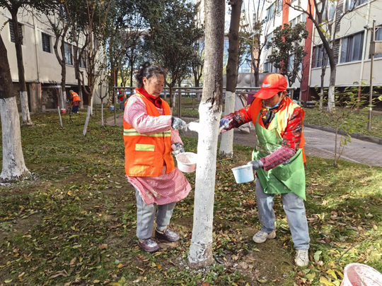 細(xì)心的業(yè)主不難發(fā)現(xiàn),樹(shù)木已悄然穿上整齊的“冬裝”。物業(yè)工作人員有條不紊地對(duì)喬木根部進(jìn)行涂白處理。這層白色“防護(hù)衣”不僅美觀,更是樹(shù)木越冬的“守護(hù)者”——它能有效反射部分陽(yáng)光,減緩樹(shù)干因晝夜溫差過(guò)大而導(dǎo)致的凍裂風(fēng)險(xiǎn),同時(shí)清除樹(shù)皮縫隙中潛藏的害蟲(chóng)及蟲(chóng)卵,為來(lái)年春季樹(shù)木茁壯成長(zhǎng)打下堅(jiān)實(shí)基礎(chǔ)。